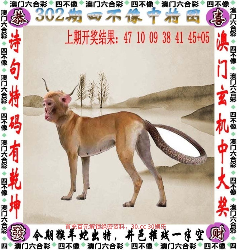 | 302期:今期猴羊蛇出特,井邑摧残一半空。开猴22准 ①杀马龙兔 ②图解特肖猴羊蛇狗牛 ③合双+小数 本人取特都是有思路可寻,对错看天意,喷狗绕道 |